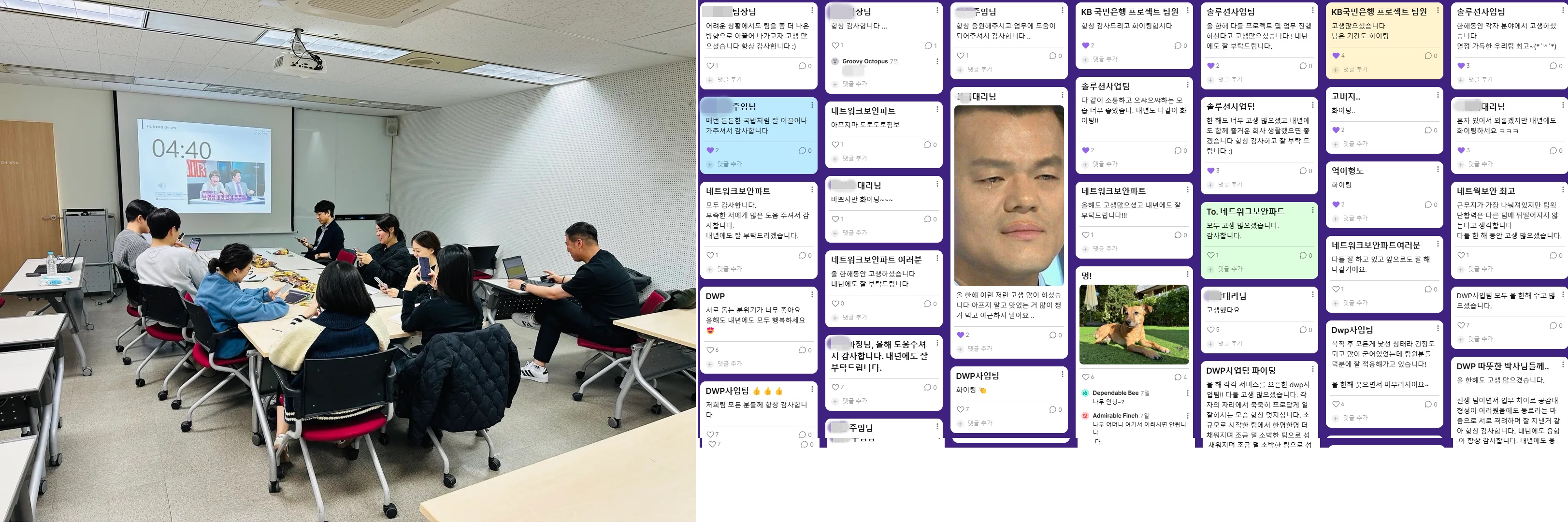 이번 세션은 부서 내 구성원들이 한 해 수행한 업무 성과 공유를 통해 상호 이해 및 협업 환경 토대 마련이 목적이었다. 프로그램으로는 구성원에 대한 감사 고백, 개별 연간 수행 업무 및 성과 공유, 격려 및 피드백, 시상으로 이루어졌다. 특히, 이번 성과 리뷰 세션은 AK아이에스에서 올해 출시한 그룹웨어인 "AK ON"과 네이버웍스 외 다양한 협업툴을 활용하여 온오프라인에서 개인별 발표와 실시간 격려 및 피드백을 하는 등 적극적인 소통의 장이 되었다.