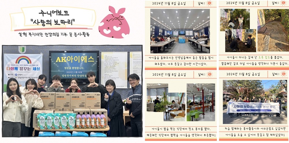 주니어보드에서 봉사활동에 참여한 황유림 주임은 “이번 활동으로 아이들을 도울 수 있어 뜻 깊었고, 아이들을 만날 생각을 하면서 준비하는 시간들은 설랬고, 아이들을 위해 봉사할 수 있어 행복한 경험이었다”고 소감을 전했다. AK아이에스의 이찬성 대표는 더 좋은 사회가 되도록 조금이라도 보탬이 되고자 하는 노력을 이어가겠다는 뜻을 밝혔다.