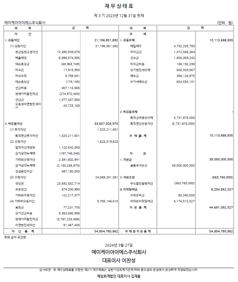 제 3기 에이케이아이에스(주)재무상태표 공고